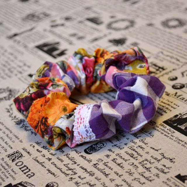 サイズ 10cm(商品の最大の直径) 3段フリルのシュシュです♪苺やレースやチェック柄のダブルガーゼで作っています。