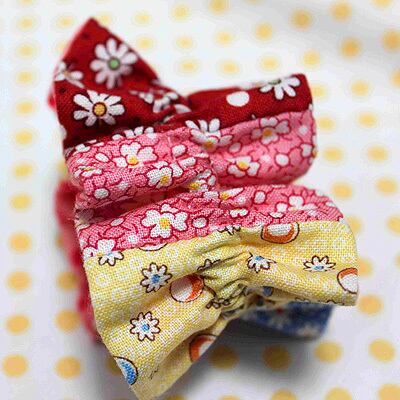 キッズ向けの小さなダブルフリルシュシュです。いろいろなお花の生地をパッチしています。内側はピンクと赤のドット生地でリバーシブルでも使えます。