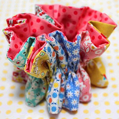 色々な生地をパッチしたダブルフリルシュシュです。お花や鳥さんの生地をパッチしています。内側はピンクと赤のドット生地でリバーシブルでも使えます。
