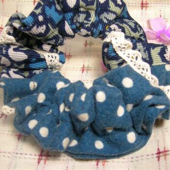 リスやウサギなどたくさんの動物の付いた生地と青緑のドット柄を合わせて、レースを斜めに渡しました。厚めの生地を大分重ねたので、固いボリュームのあるシュシュになりましたが、ゴムの伸びには問題はありません。