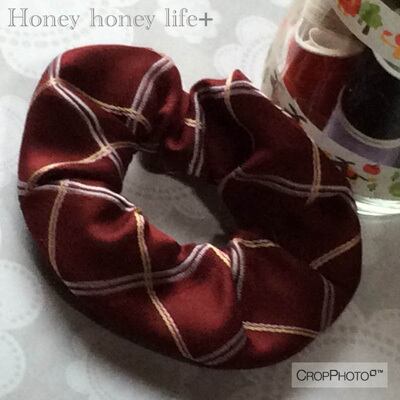 夫の古いネクタイで作りました。しっかり洗ったのでご安心を!太目のヘアゴムを使ったので、素材はつるつるですが、滑り落ちにくくなっています。シックな色なので、秋冬にもおススメです。