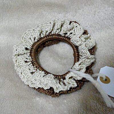 サイズ 10cm(商品の最大の直径) 薄いベージュとモカ色の「カフェ風」な色合わせで作ったダブルフリルシュシュです。