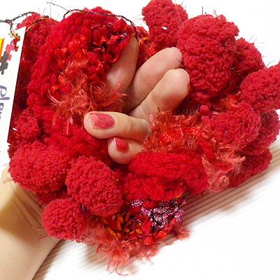 〔赤海栗〕色々な糸を使用し、かなりボリュームのあるシュシュができました。お団子などのまとめがみにおススメ!※使用しているうちに糸がでてきますが、ほどけないようになってます。